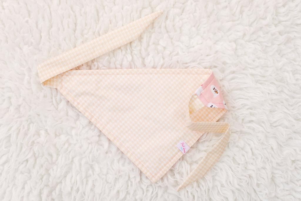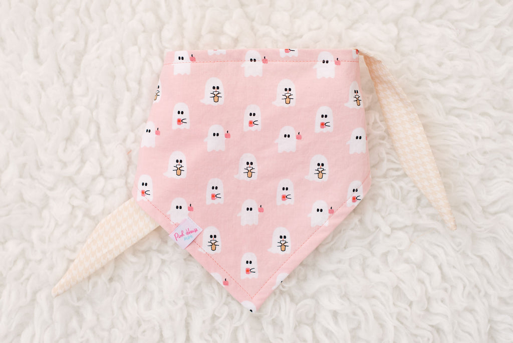 Did I make another pink ghost Halloween bandana? Yep! Does your dog need it? Mine does! This version is so soft, both in texture and color palette.  Adorable little white ghosts sipping from iced lattes and pink coffee cups. Some have tiny pink pumpkins in hand and all are festive and downright huggable.