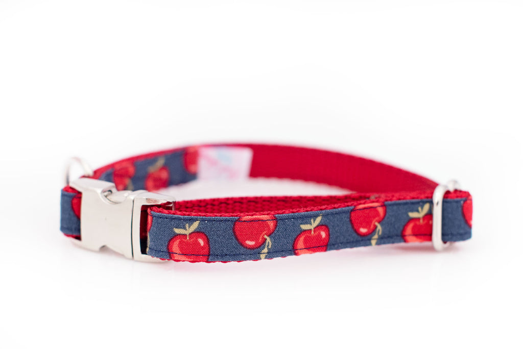It's apple season! Since I miss apple picking living in the south, this collar is going to do! Dark red apples on a navy background are so pretty and just scream "it's fall, y'all". Their little green stems add more dimension, and on the one inch version you'll also see tiny white blossoms. Red nylon backing perfectly picks up on the apple color and add to the classic red and navy combo.